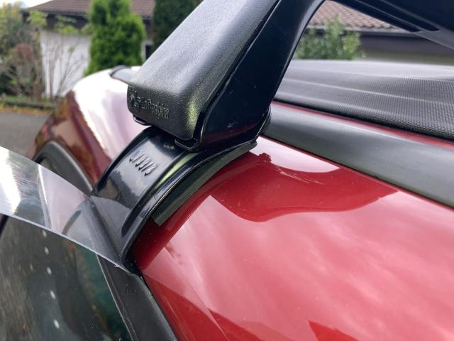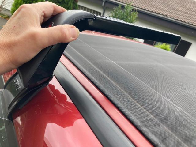 Beim Original-Träger sitzt der Lastpunkt direkt neben der Gummileiste, auch da ist aber der Abstand der Metallleiste zum Dachblech egal, weil es nur um den Zug zum Lastpunkt geht. Da der Lastpunkt in der Kurvenlinie näher an der Seite dran ist, liegt der Haltewinkel mehr am Dachblech an.